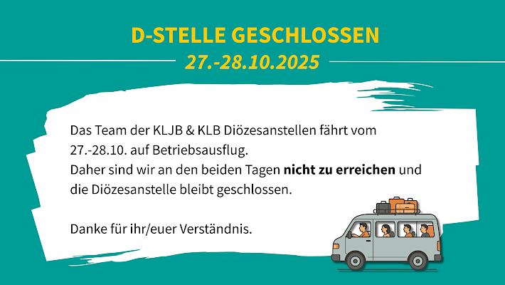 Das Team der KLJB & KLB Diözesanstellen fährt vom 27.-28.10. auf Betriebsausflug. Daher sind wir an den beiden Tagen nicht zu erreichen und die Diözesanstelle bleibt geschlossen.