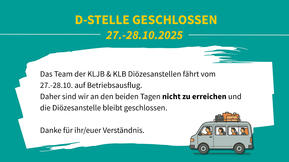 Das Team der KLJB & KLB Diözesanstellen fährt vom 27.-28.10. auf Betriebsausflug. Daher sind wir an den beiden Tagen nicht zu erreichen und die Diözesanstelle bleibt geschlossen.
