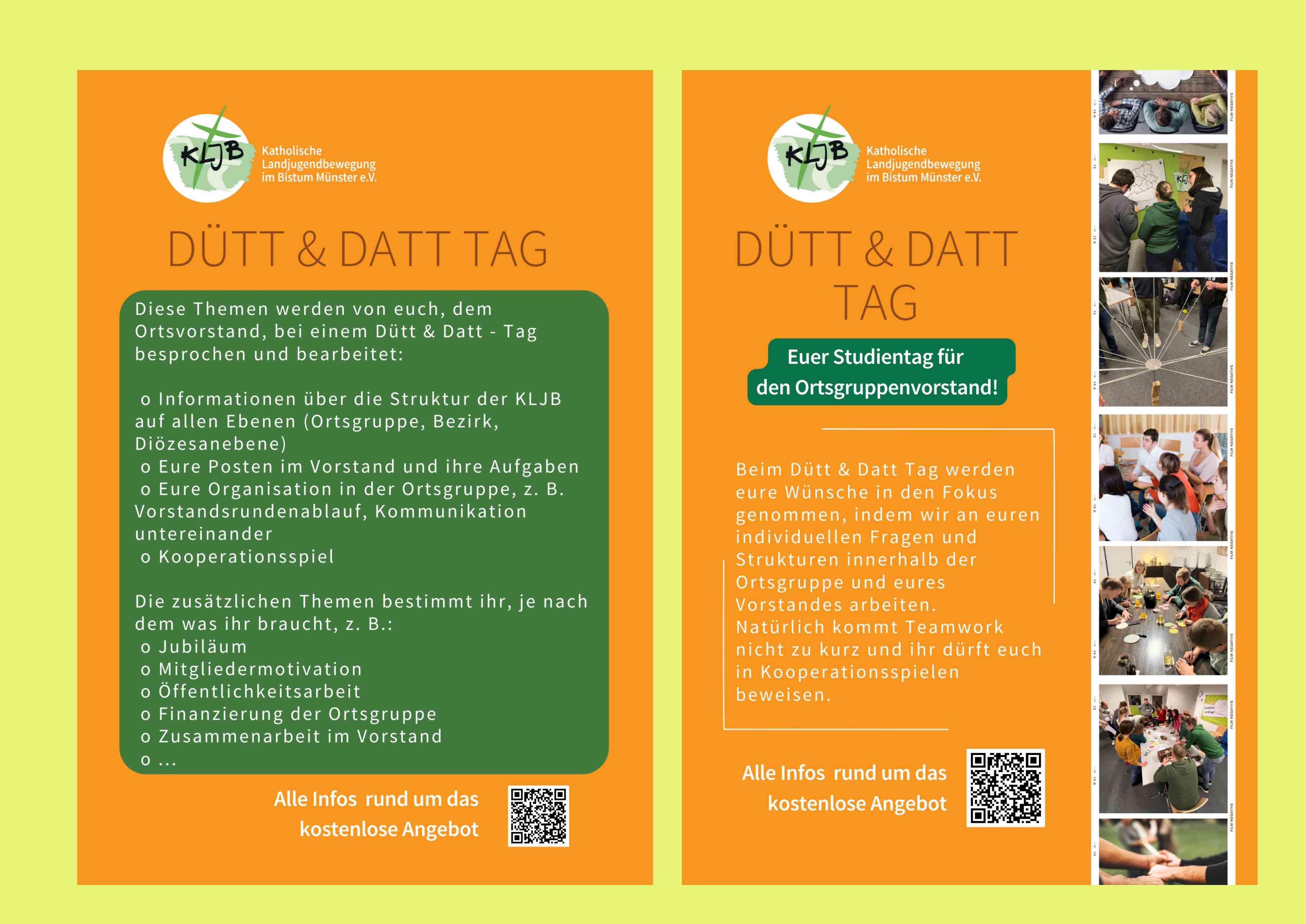 Jede Ortsgruppe kann je nach Verfügbarkeit einen kostenlosen Dütt und Datt Tag bei uns buchen. Dieser Studientag kann bei euch im Ort stattfinden oder in der D-Stelle in Münster. Ihr müsst mindestens 7 Personen sein. Sinnvoll ist natürlich, dass ihr als Vorstand vollzählig seid.